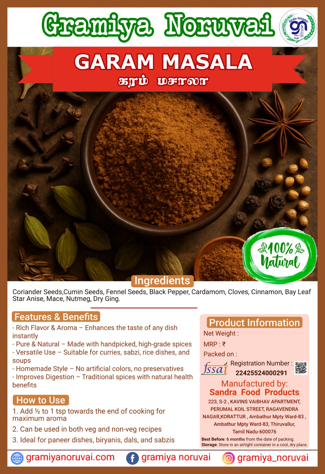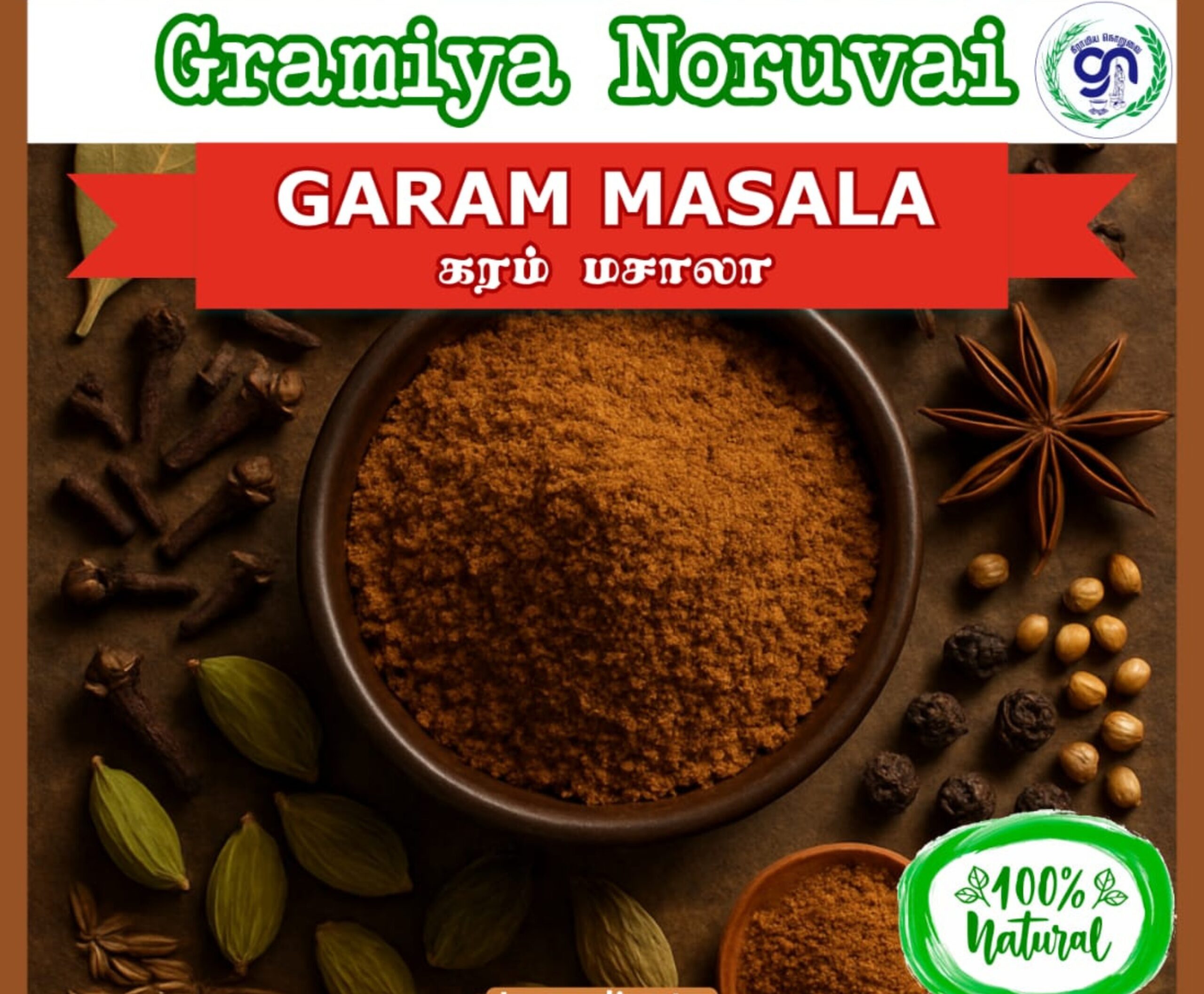 Gramiya Noruvai Garam Masala is a finely ground spice blend made using a traditional homemade recipe. It combines a curated mix of high-quality, handpicked spices for rich flavor and authentic aroma. Perfect for everyday cooking, it enhances taste and supports digestion with natural benefits. Ideal for curries, rice dishes, sabzis, and more.